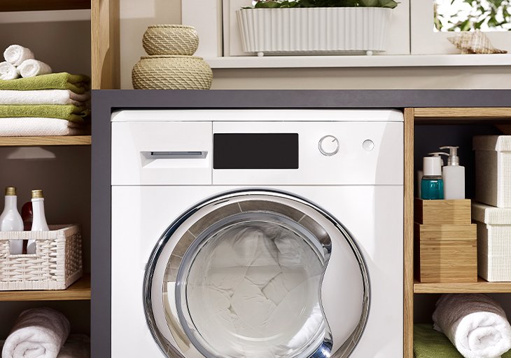 - Shelving and cabinets: Install shelves or cabinets above or beside the washing machine and dryer. Use them to store laundry detergents, fabric softeners, stain removers, and other cleaning supplies. Keep dangerous items out of reach of children.