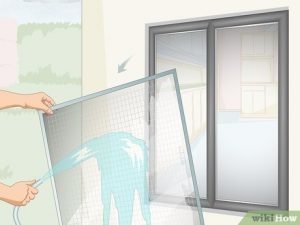 - Remove any window screens and clean them if necessary. Pop off or unscrew the windows screens and set them on a clean tarp or drop cloth outside. Rinse them thoroughly with a garden hose on low pressure to clean off dust and dirt. Shake the excess water off the screens, dry them with a clean towel as much as you can, and let them air dry all the way.[2]