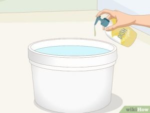 - Fill a bucket with clean water and 1 squirt of liquid dish detergent. Fill a clean bucket with clean, cool water from the faucet. Squeeze 1 squirt of liquid dish detergent from the bottle into the water in the bucket to make a window washing solution.[5]