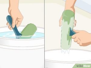 - Dip a window scrubber or sponge into the bucket and wring it out. A window scrubber is ideal for cleaning medium to large windows as it will cover more area. A large sponge, like the kind for washing cars, works fine as well.[6]