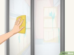 - Scrub the glass with the sponge soaked in a solution of clean, cool water and liquid dish detergent. Squeegee each pane clean with 1 stroke from top to bottom with your custom-cut squeegee.