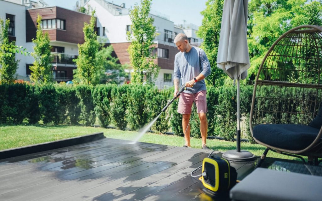 - Rinse with Water: Once you’ve scrubbed the entire patio, use a garden hose or a pressure washer to rinse off the cleaning solution and loosened dirt. Be cautious with a pressure washer as excessive pressure can damage some surfaces.