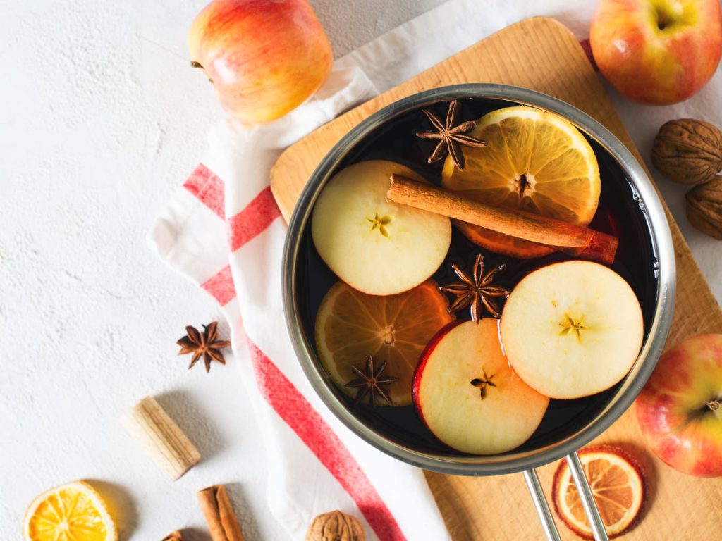 Simmer pots are an easy way to fill your home with delightful scents. Simply add sliced apples, cinnamon sticks, and water to a pot and let it simmer on the stove.